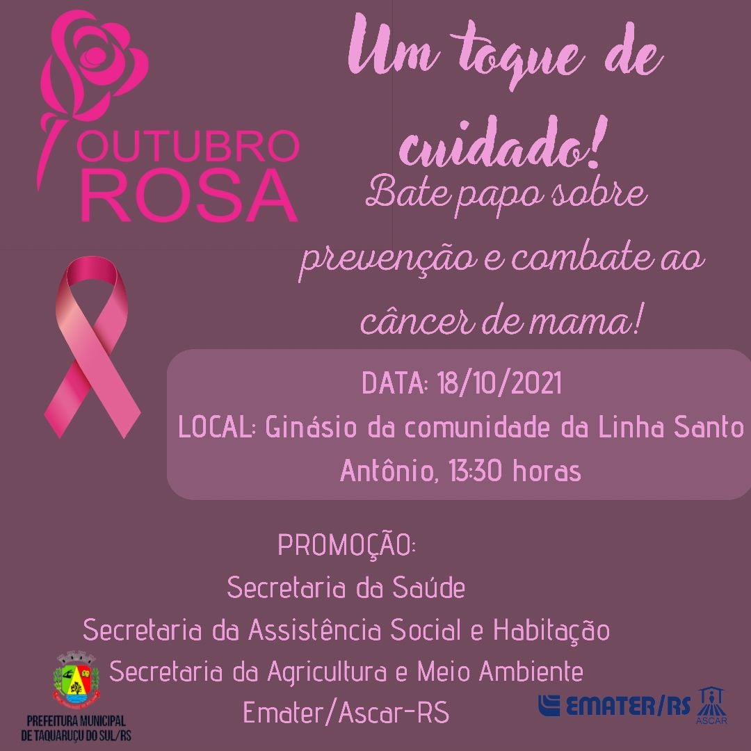 A administração municipal de Taquaruçu do Sul através das secretarias da saúde, assistência social e habitação, agricultura e meio ambiente, juntamente com a Emater, convidam a todas as mulheres do município a participarem da campanha de prevenção e combate ao câncer de mama, \"UM TOQUE DE CUIDADO\".A campanha vêm de encontro ao mês de prevenção ao câncer de mama e leva até as comunidades do município, a discussão e reflexão sobre o tema.