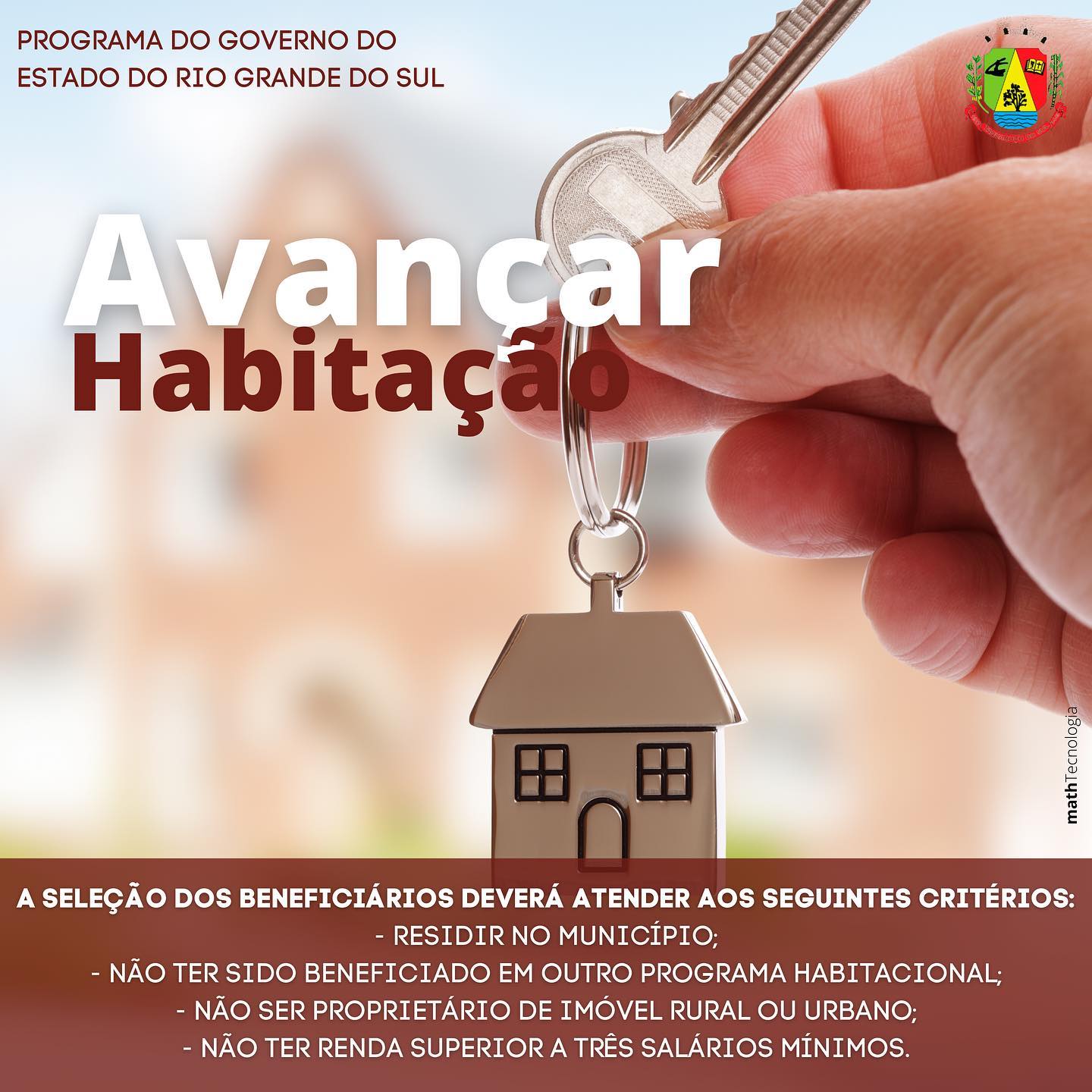 Com o objetivo de atender as necessidades de habitação da população de baixa renda nas áreas urbanas, garantindo o acesso à moradia digna com padrões mínimos de sustentabilidade, segurança e habitabilidade, o Município irá aderir ao Programa Avançar Habitação do Governo do Estados do Rio Grande do Sul \"A CASA É SUA\".Para participar, os interessados devem ir até a Secretaria de Assistência Social e Habitação, e se cadastrar junto ao Programa.