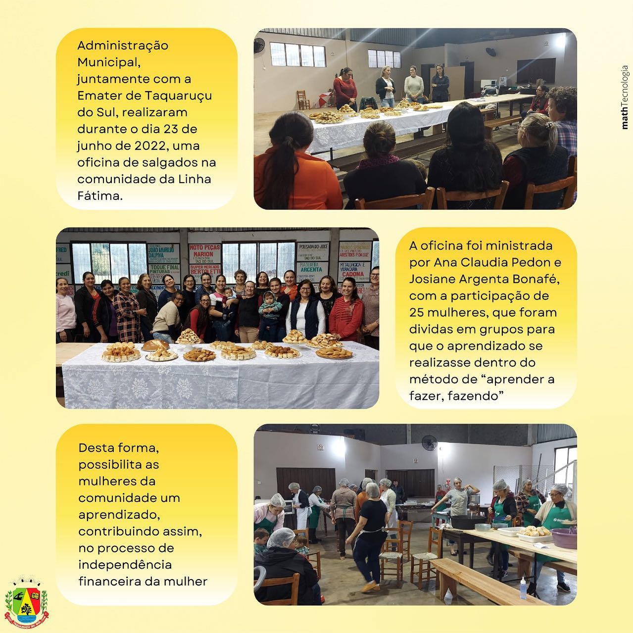 Com intuito de estimular o desenvolvimento das famílias com qualidade de vida, a Administração Municipal, juntamente com a Emater de Taquaruçu do Sul, realizaram durante o dia 23 de junho de 2022, uma oficina de salgados na comunidade da Linha Fátima. A oficina foi ministrada pelas extensionistas da Emater Ana Claudia Pedon e Josiane Argenta Bonafé, com a participação de 25 mulheres, que foram dividas em grupos para que o aprendizado se realizasse dentro do método de aprender a fazer, fazendo, e durante as atividades práticas realizaram o preparo das massas e modelagem de diversos tipos de salgadinhos.