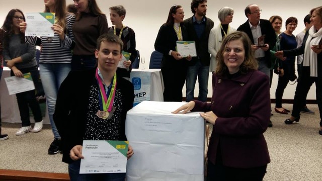 A certificação de medalhista de ouro da OBMEP 2016 ao aluno Junior Pessotto foi entregue em Passo Fundo, durante cerimônia que contou com alunos de vários municípios do Estado, e com a participação da professora Adriana Zanchet e da Secretária Municipal de Educação Alda da Rosa Martins.