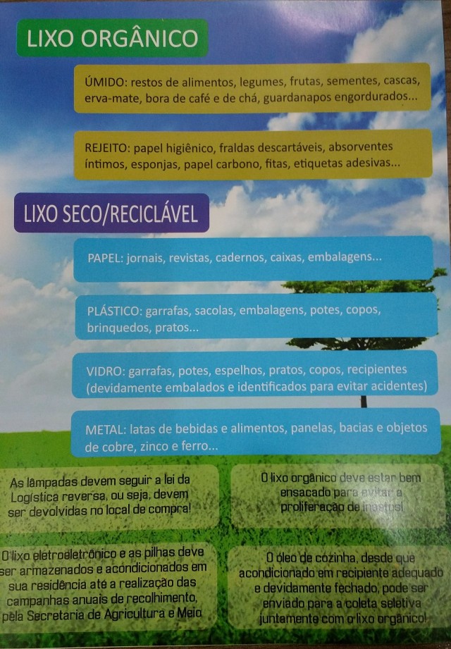 “A obrigatoriedade de proceder à coleta seletiva do lixo veio com a implantação da Política Nacional de Resíduos Sólidos, e deveria ter sido iniciada ainda no ano de 2014. Entretanto somente agora está sendo implantada, porque antes buscou-se pela conscientização da população, inclusive com campanhas para realização da compostagem, desenvolvidas em parcerias com outras secretarias, como Secretaria de Saúde e Secretaria de Educação. Mas mesmo havendo a coleta seletiva, deve a população continuar fazendo compostagem como vem fazendo ao longo dos anos”.