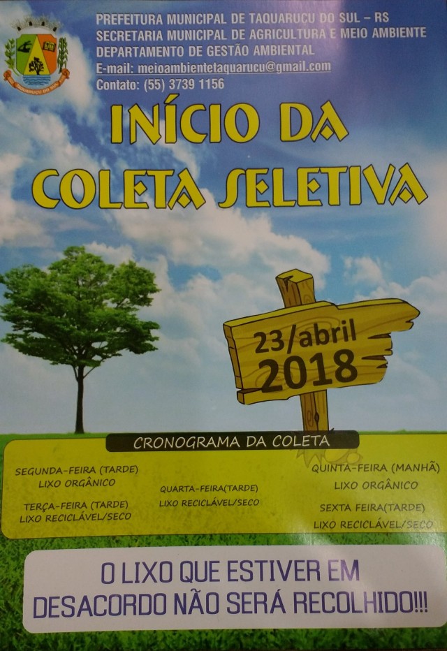 Procurando se adequar ao que dispões a Lei Federal 12.305/2010, que instituiu a Política Nacional de Resíduos Sólidos e impõe a responsabilidade compartilhada pela destinação dos resíduos, incluindo a coleta seletiva, o setor de Meio Ambiente do Município deu início ao processo de adequação da coleta do lixo na cidade.