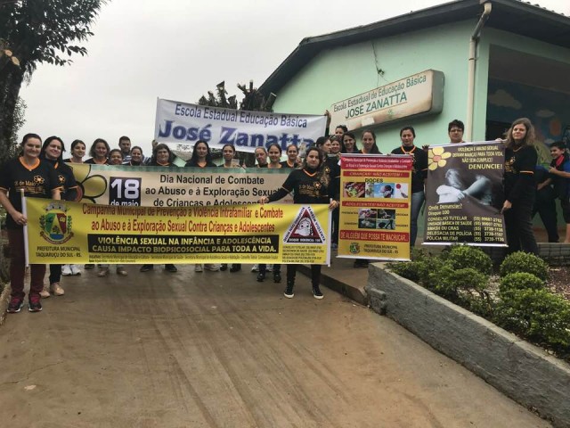 As Secretarias Municipais de Saúde; Educação e Cultura; Assistência Social e Habitação; Conselho Tutelar, Escola Estadual José Zanatta e Escolas Municipais Pedacinho do Céu e Afonso Balestrin, promoveram na sexta-feira, 18 de maio, a Campanha de Prevenção a Violência Intrafamiliar e Combate ao Abuso e Exploração Sexual Contra Crianças e Adolescentes, que contou também com apoio da Brigada Militar, Polícia Civil e Rádio Comunitária Taquaruçu FM.