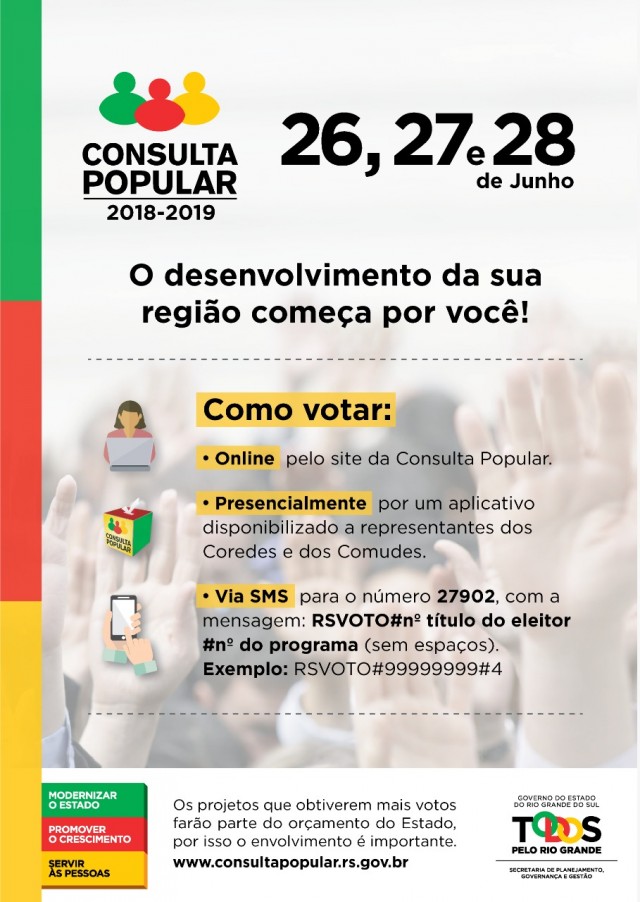 Os votos poderão ser realizados através do site da Consulta Popular http://www.consultapopular.rs.gov.br, nos dias 26, 27 e 28 de junho e via SMS para o número 27902, com a palavra RSVOTO#(Nº do título de eleitor)#(Nº do programa, de 1 a 10), apenas nos dias 26 e 27 de junho.