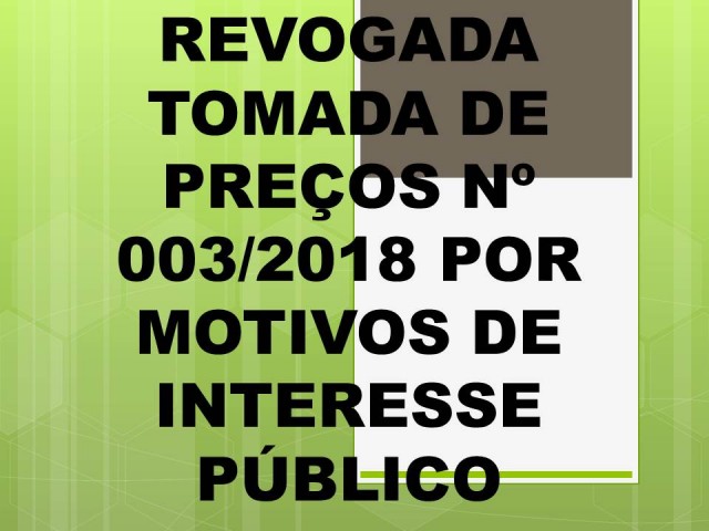 Por motivos de interesse Público fica revogada a Licitação TP 003/2018.