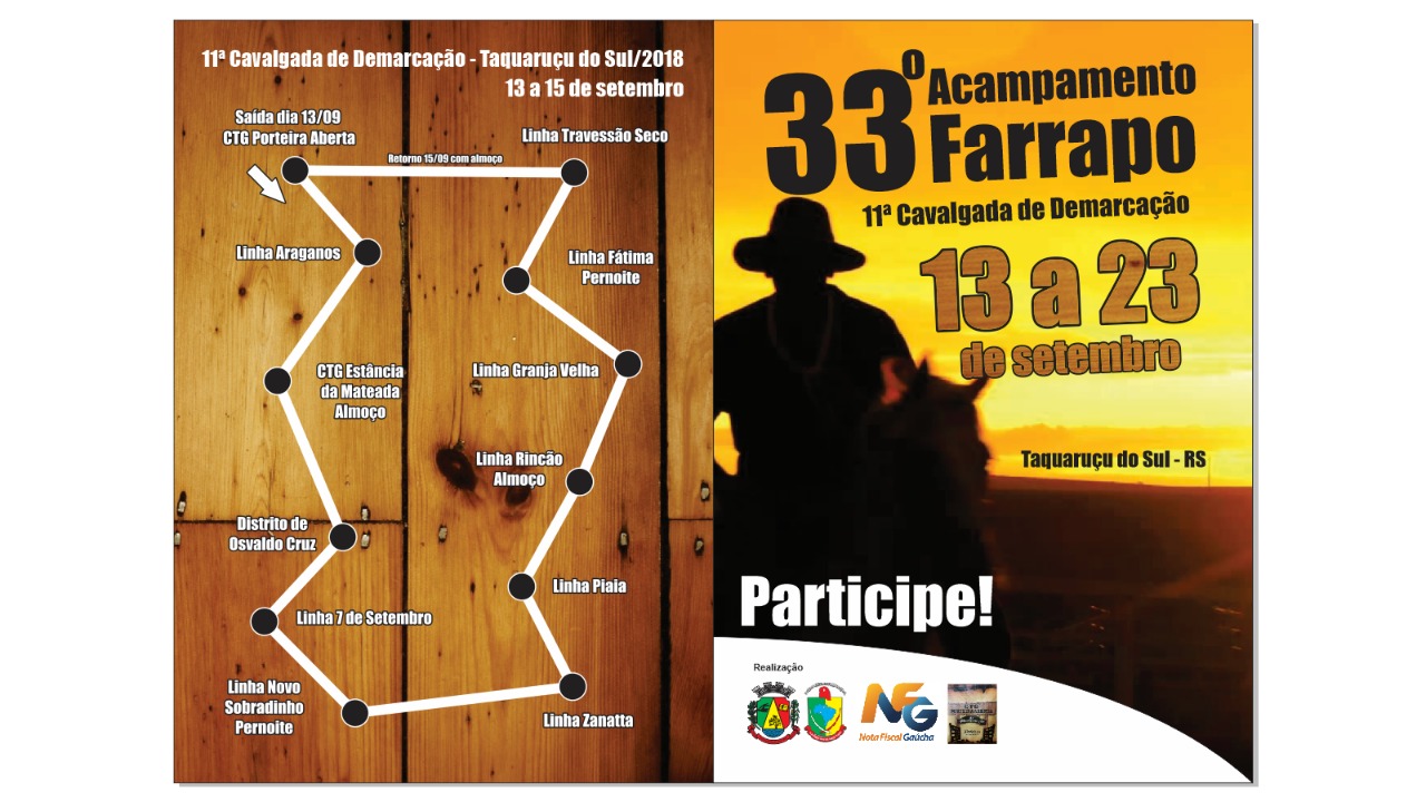 Dias 13, 14 e 15/2018: Cavalgada da Demarcação percorrendo o interior do Município. Saída às 8h do dia 13, de frente do CTG Porteira Aberta e retorno no dia 15 para abertura do 33º Acampamento Farrapo.