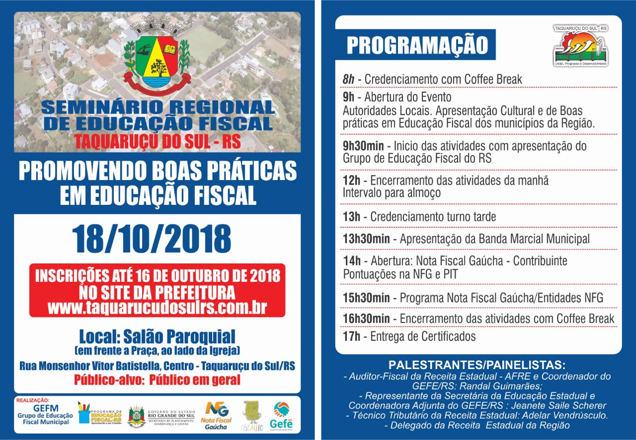 Com o objetivo de promover e institucionalizar a Educação Fiscal para o efetivo exercício da cidadania, visando ao constante aprimoramento da relação participativa e consciente entre o Estado e o cidadão e da defesa permanente das garantias constitucionais, o Município de Taquaruçu do Sul estará realizando o I Seminário Regional de Educação Fiscal.A organização do Seminário é uma parceria do Município, através do Grupo de Educação Fiscal Municipal GEFM, com o Grupo Estadual de Educação Fiscal - GEFE.