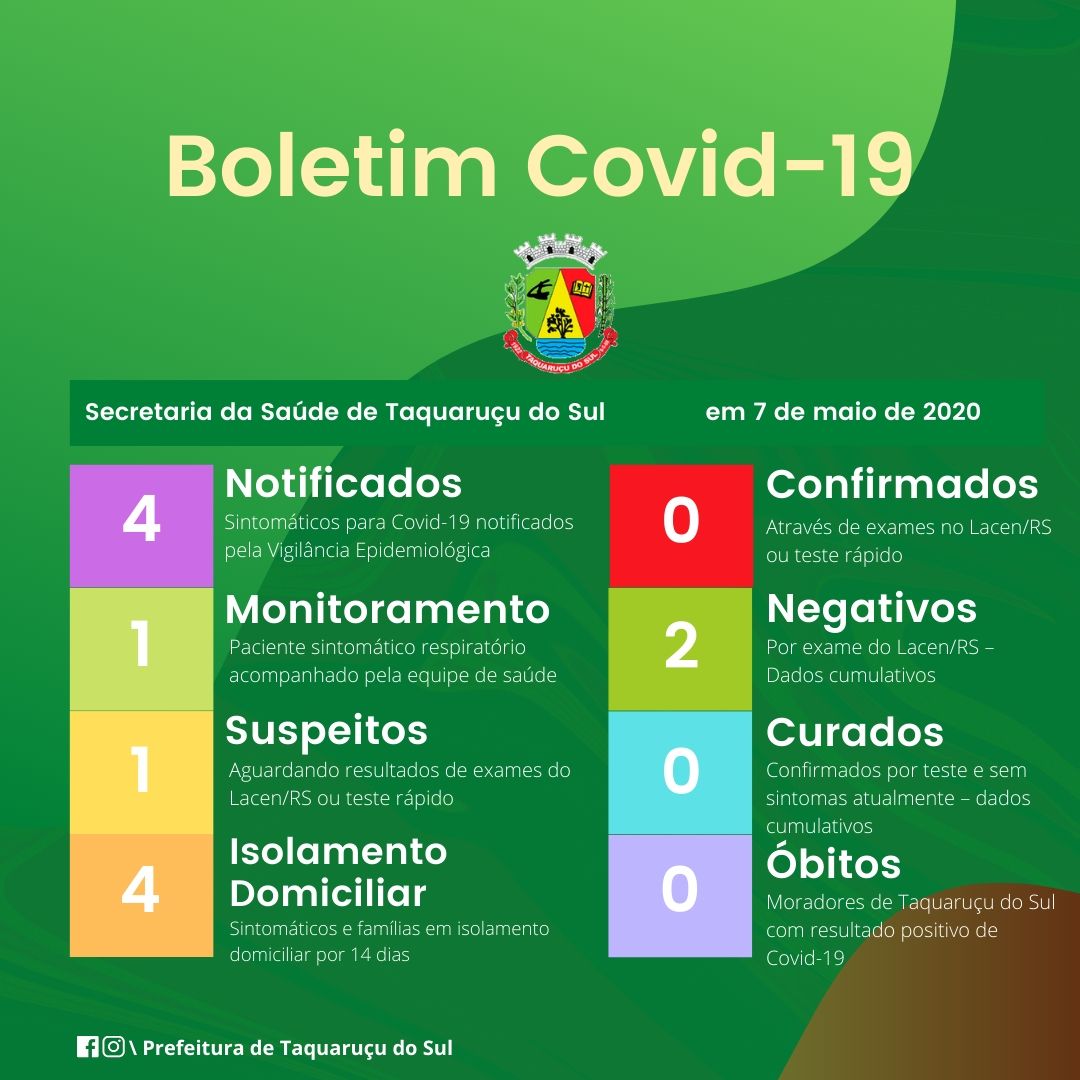 A partir desta quinta-feira, 7, a Secretária da Saúde, de Taquaruçu do Sul, divulgará todos os dias um boletim epidemiológico sobre o Coronavírus (Covid-19). Os boletins serão divulgados no site da Prefeitura, além das redes sociais Facebook e Instagram, a partir das 18 horas, com o intuito informar a comunidade sobre os casos acompanhados pela Saúde. O secretário da pasta, Ivan Albarello, reforça que estes dados oficiais do município, servem para evitar a circulação de notícias falsas que geram pânico e confusão.