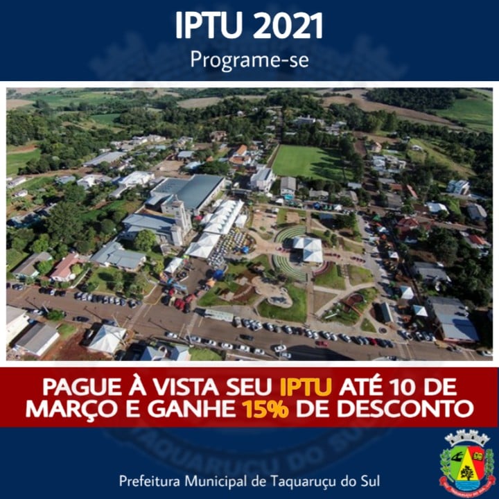 A Secretaria Municipal da Fazenda comunica aos proprietários de imóveis urbanos do Município, que o calendário para o pagamento do IPTU no exercício de 2021, ficou assim estabelecido: