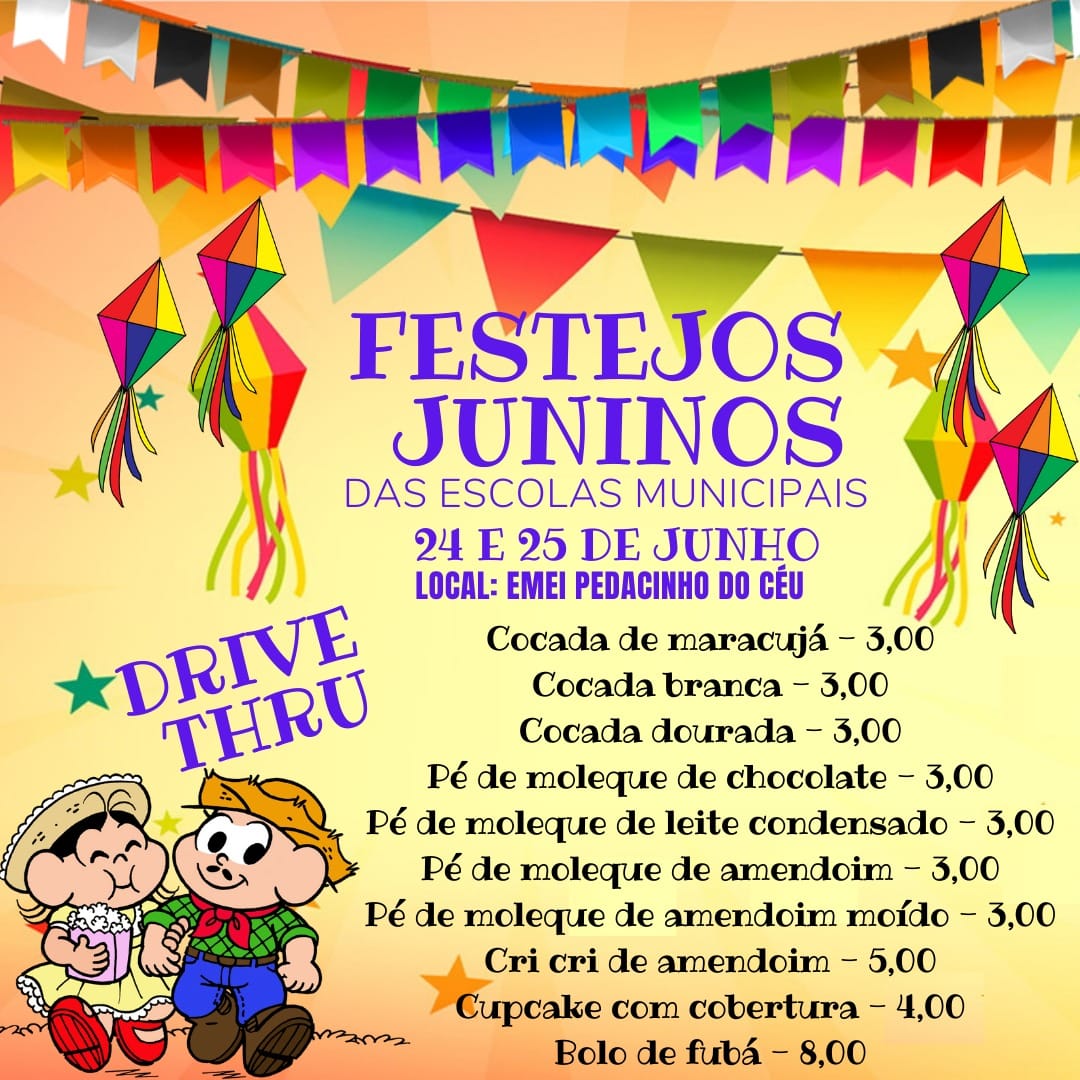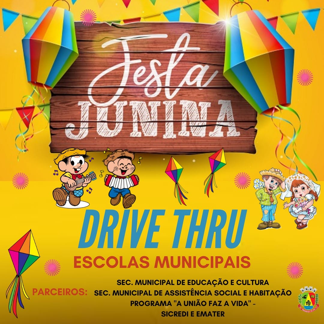 As Escolas Municipais Afonso Balestrin e Pedacinho do Céu, em parceria com as Secretarias Municipais da Educação e da Assistência Social, Programa A União Faz a Vida Sicredi e Emater, realizarão nos dias 24 e 25 de junho, quinta e sexta-feira, das 8h às 11h e das 13h às 17h, nas dependências da EMEI Pedacinho do Céu, a venda de quitutes em comemoração aos festejos juninos, na modalidade Drive Thru.