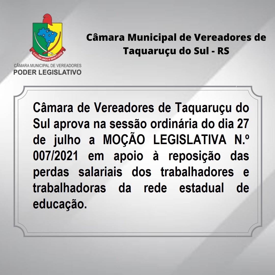Diante do exposto, a Câmara Municipal aprovou por unanimidade a presente moção, já que, esta categoria realiza uma atividade essencial, e sua valorização salarial e profissional devem ser prioridades para o Rio Grande do Sul. A moção será encaminhada à Assembleia Legislativa do Rio Grande do Sul e ao Palácio Piratini, pleiteando pela reposição das perdas salariais acumuladas pelos(as) trabalhadores(as) da rede estadual de educação.