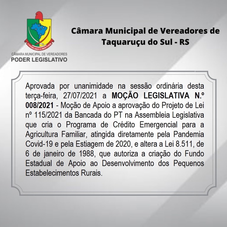 Tendo em vista a importância da presente Moção a mesma foi aprovada por unanimidade, e será enviada aos responsáveis pela Secretaria da Agricultura no Estado do Rio Grande do Sul.