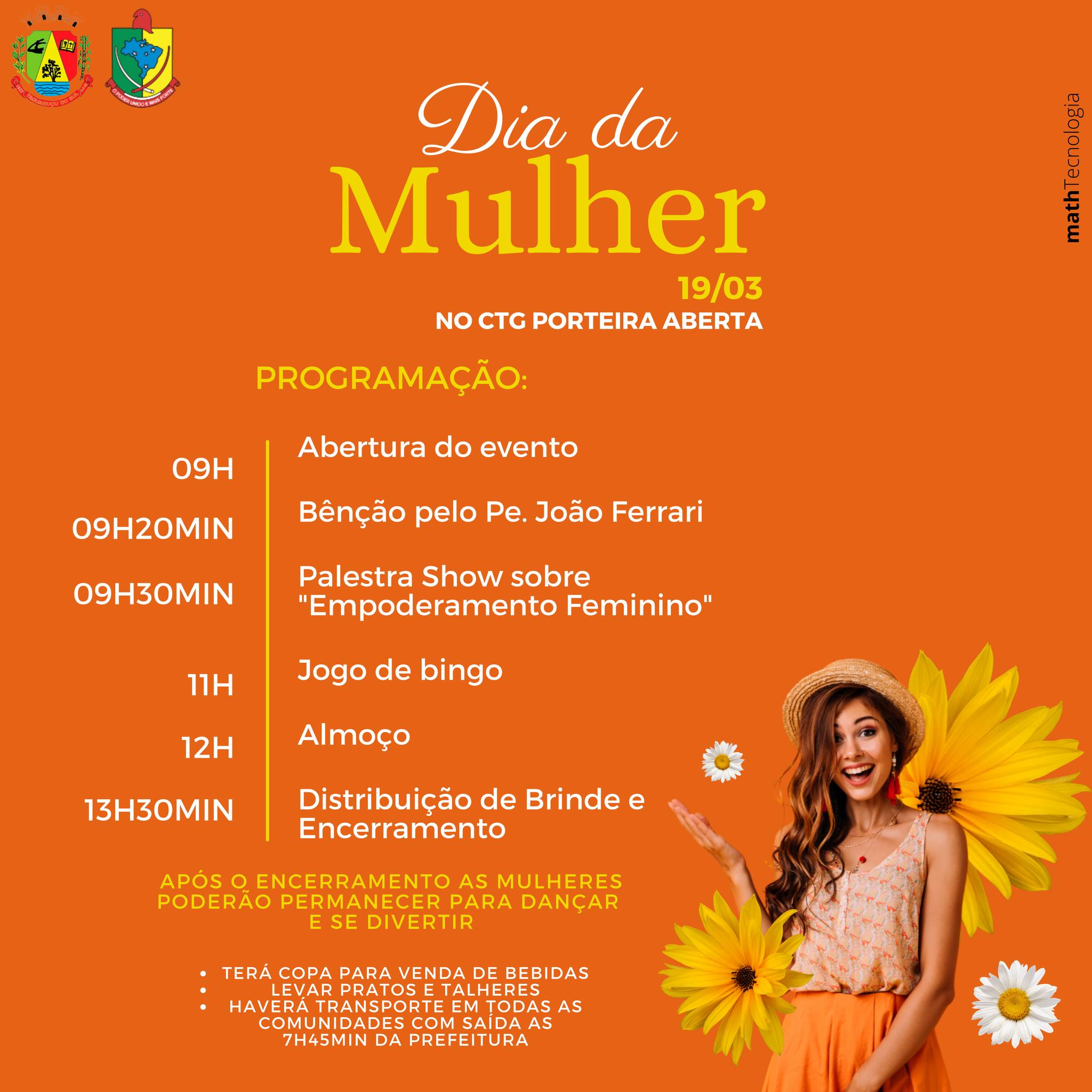 A Administração Municipal de Taquaruçu do Sul, com o intuito de valorizar a mulher, convida a todas para o Encontro Municipal de Mulheres a se realizar no dia 19/03, com a seguinte programação: