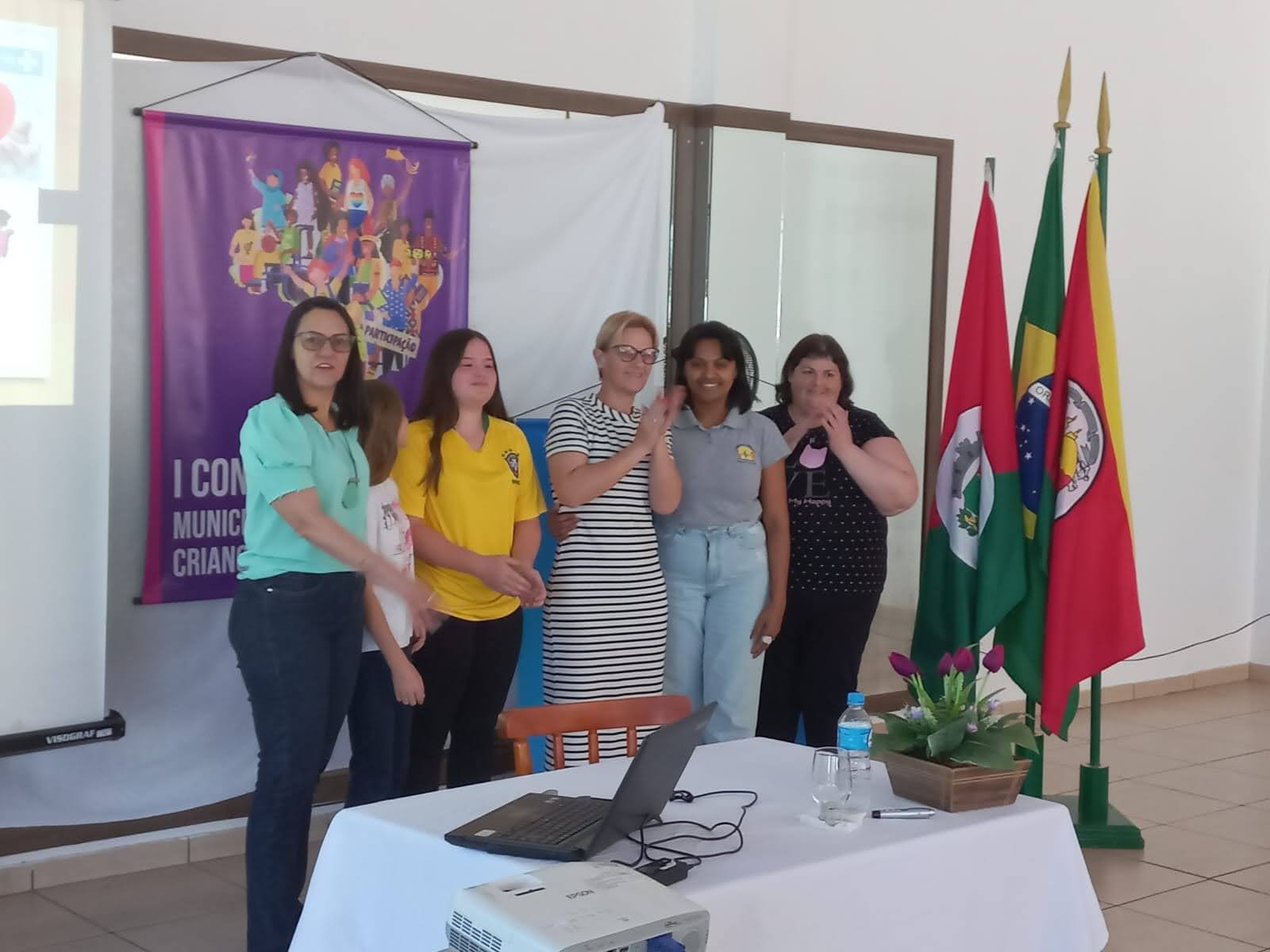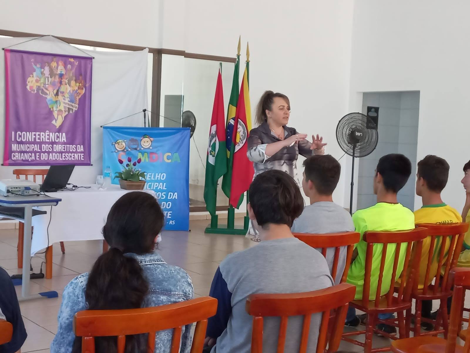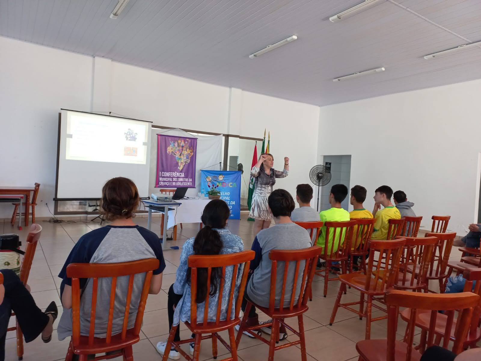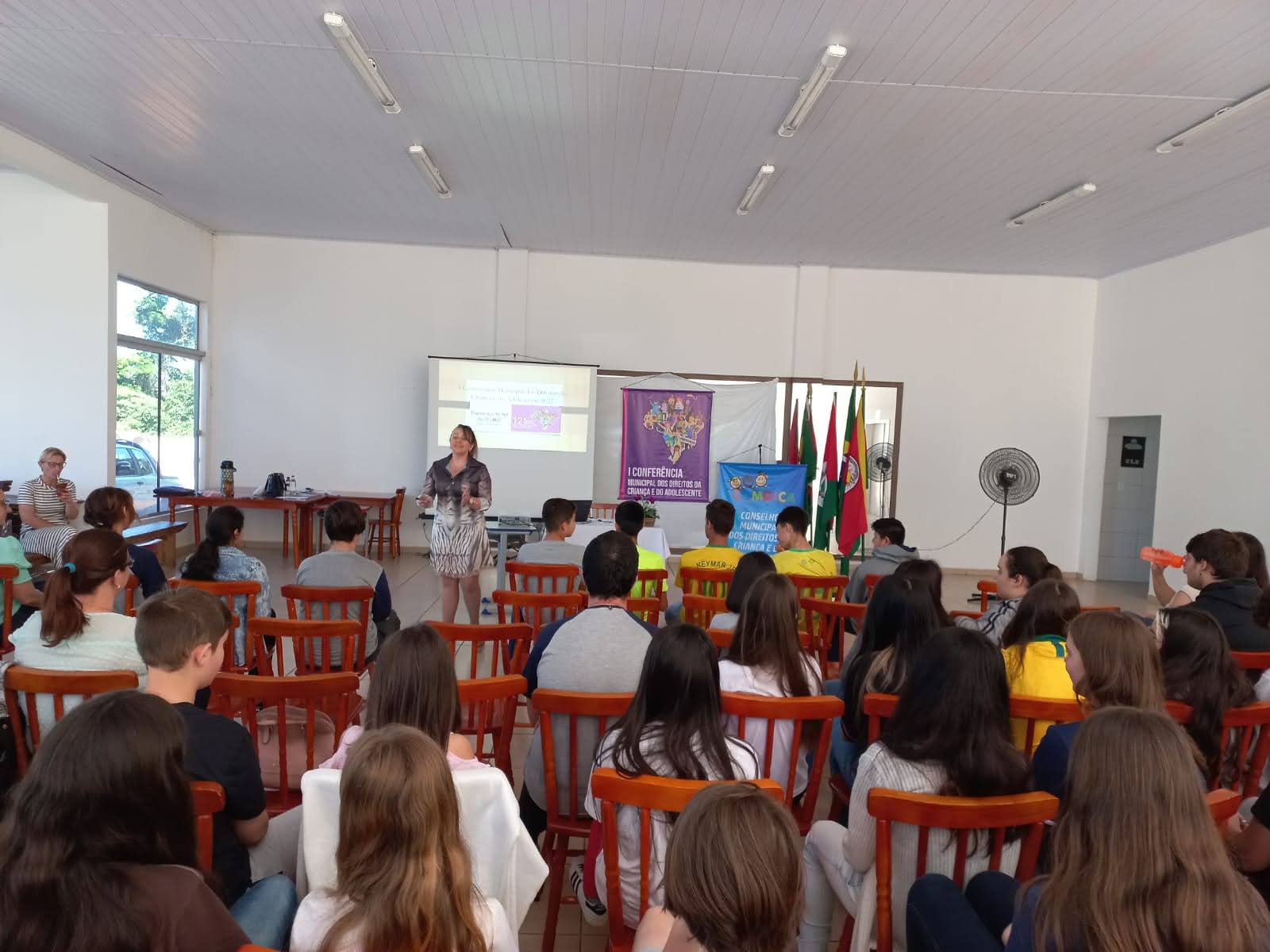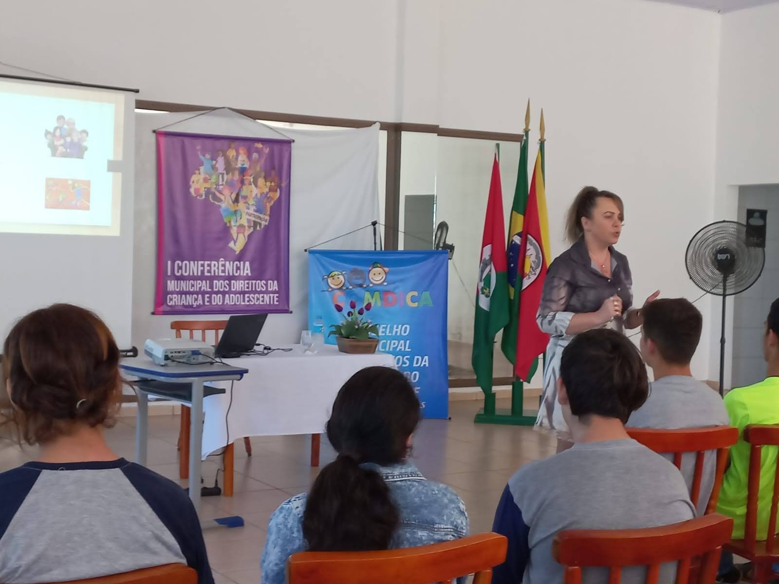 O objetivo principal da conferência foi debater e buscar alternativas para melhorar os reflexos da pandemia da Covid-19 deixados na vida das crianças, adolescentes e suas famílias, construindo propostas de ação e políticas públicas que garantam os seus direitos no contexto pandêmico e pós-pandemia, e para discutir sobre isto Fabiana Zanardi, Assistente Social no Município de Palmitinho, conduziu os trabalhos e palestrou para os presentes falando sobre o objetivo da conferência e a importância que a mesma tem para que sejam levantadas propostas para melhorar o contexto atual em que vivem nossas crianças e adolescentes a partir das demandas escolhidas por eles.