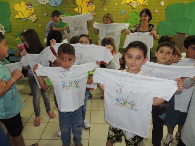 As camisetas foram adquiridas com recursos do PUFV e colaboração dos pais e podem ser usadas como uniforme escolar e para divulgar o projeto na comunidade.