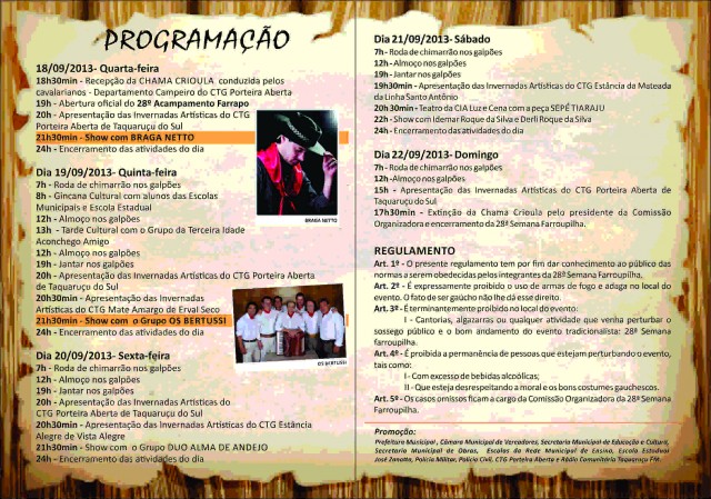 Abaixo segue a programação completa do 28º Acampamento Farrapo:
