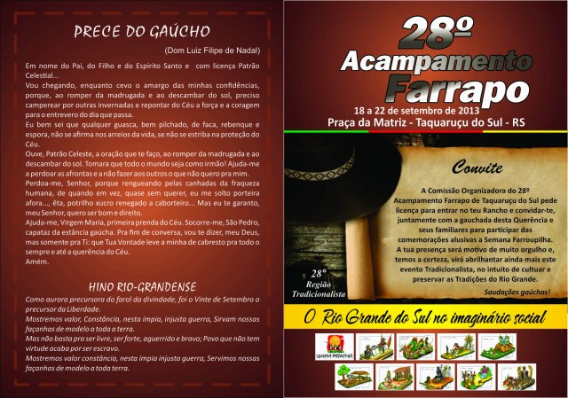 Com o tema “O RIO GRANDE DO SUL NO IMAGINÁRIO SOCIAL”, acontece dos dias 18 a 22 de setembro, na Praça Mons. Albino Ângelo Busatto, o 28º Acampamento Farrapo de Taquaruçu do Sul.