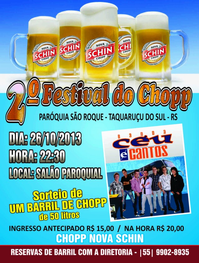 Acontece no dia 26 de outubro, no Salão Paroquial, o 2° Festival de Chopp da Paróquia São Roque de Taquaruçu do Sul. A animação ficará a cargo da Banda Céu e Cantos.