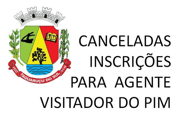 O Poder Executivo Municpal informa que, por motivo de interesse público, estão canceladas as incrições para Processo Seletivo de Agente Visitador do PIM, abertas através do edital nº 012/2014, cujo extrato foi publicado no jornal O Alto Uruguai do dia 04 de julho de 2014.