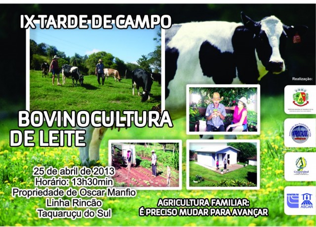 A Secretaria Municipal de Agricultura e Meio Ambiente juntamente com a Adm. Municipal, APROLTASUL, EMATER/ASCAR, STR e o Programa BALDE CHEIO, convidam todos os produtores rurais do município e região para a realização da IX TARDE DE CAMPO sobre BOVINOCULTURA DE LEITE a ser realizada dia 25 de Maio de 2013 na propriedade do Sr. Oscar Manfio, Linha Rincão.