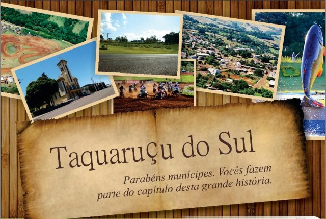A Administração Municipal, através do Prefeito Vanderlei Zanatta e do Vice Prefeito Valmir Luiz Menegat, juntamente com todos os Vereadores Municipais, parabeniza a todos os Taquaruçuenses que desde sempre acreditaram na força de seu Município e aqui estão lutando para que ele se torne cada vez mais forte e próspero, atendendo a todos os anseios da população.
