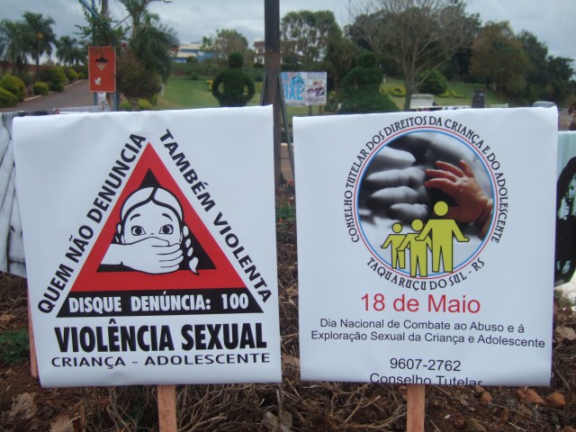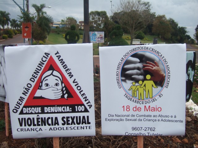 O dia 18 de maio marca o Dia Nacional de Combate ao Abuso e Exploração Sexual de Crianças e Adolescentes. Pensando na conscientização e informação da população o Conselho Tutelar de Taquaruçu do Sul, iniciou nessa segunda-feira, uma campanha de alerta sobre tal crime, cometido geralmente por familiares ou amigos próximos.