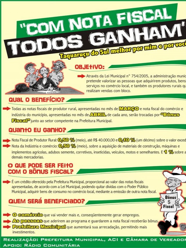 Lançado em maio de 2006, o Programa “Com Nota Fiscal Todos Ganham”, objetiva beneficiar todos os munícipes que adquirirem produtos no comércio local e também os produtores rurais que emitem nota fiscal de vendas no bloco de produtor. O bônus é um crédito oferecido pela Prefeitura Municipal proporcional ao valor das notas fiscais apresentadas, conforme a Lei Municipal n° 754/2005.