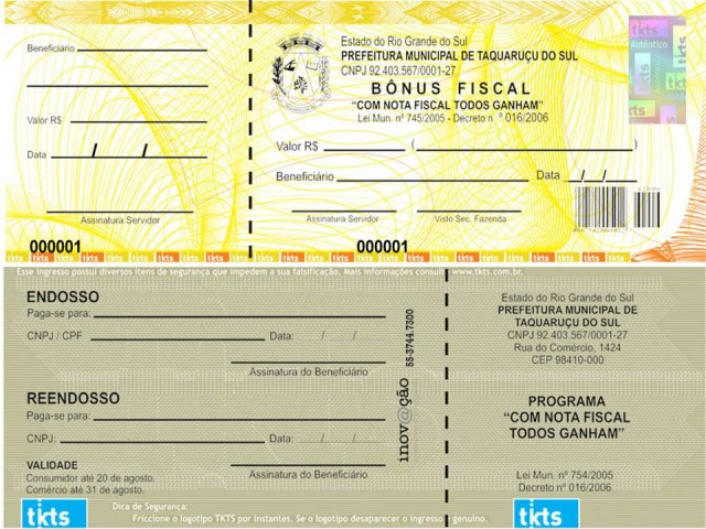 Encerrou no dia 31 de maio a retirada, pelos consumidores do Município, dos bônus fiscais referentes ao exercício de 2012, sendo que a partir do início deste mês até 31 de agosto os comerciantes locais podem receber os valores junto à tesouraria do município.