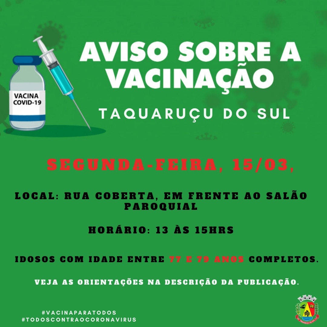 Na próxima segunda-feira, 15/03, inicia a vacinação para idosos com idade entre 77 e 79 anos completos.