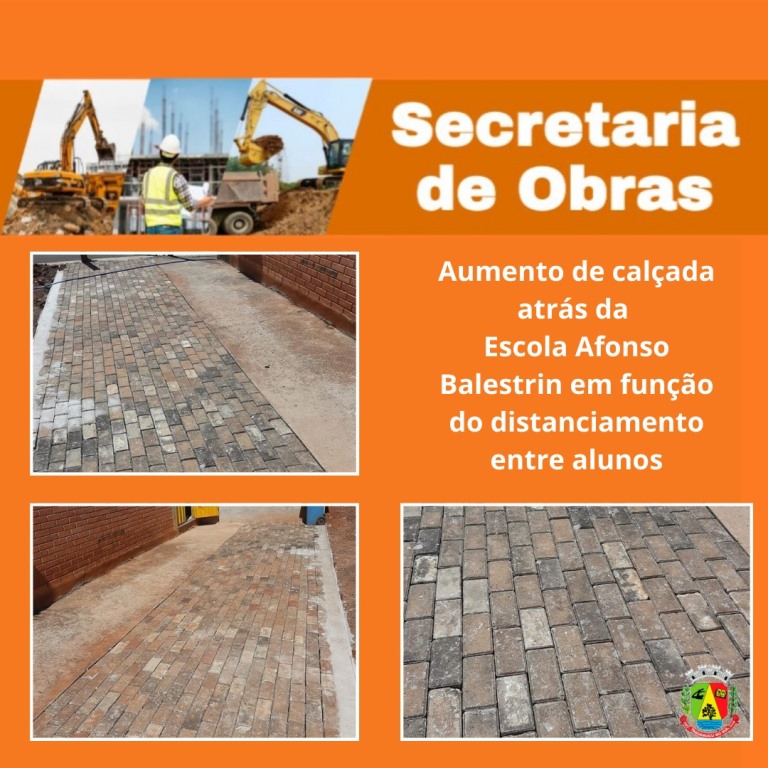 Mesmo que não estejam acontecendo as aulas presencias, a Escola Municipal Afonso Balestrin está recebendo melhorias com o objetivo de melhorar o fluxo dos alunos, permitindo que possam manter o distanciamento que eles precisam ter quando do seu retorno para a escola.Assim, a Secretaria Municipal de Obras realizou a ampliação das calçadas da parte de trás do educandário.