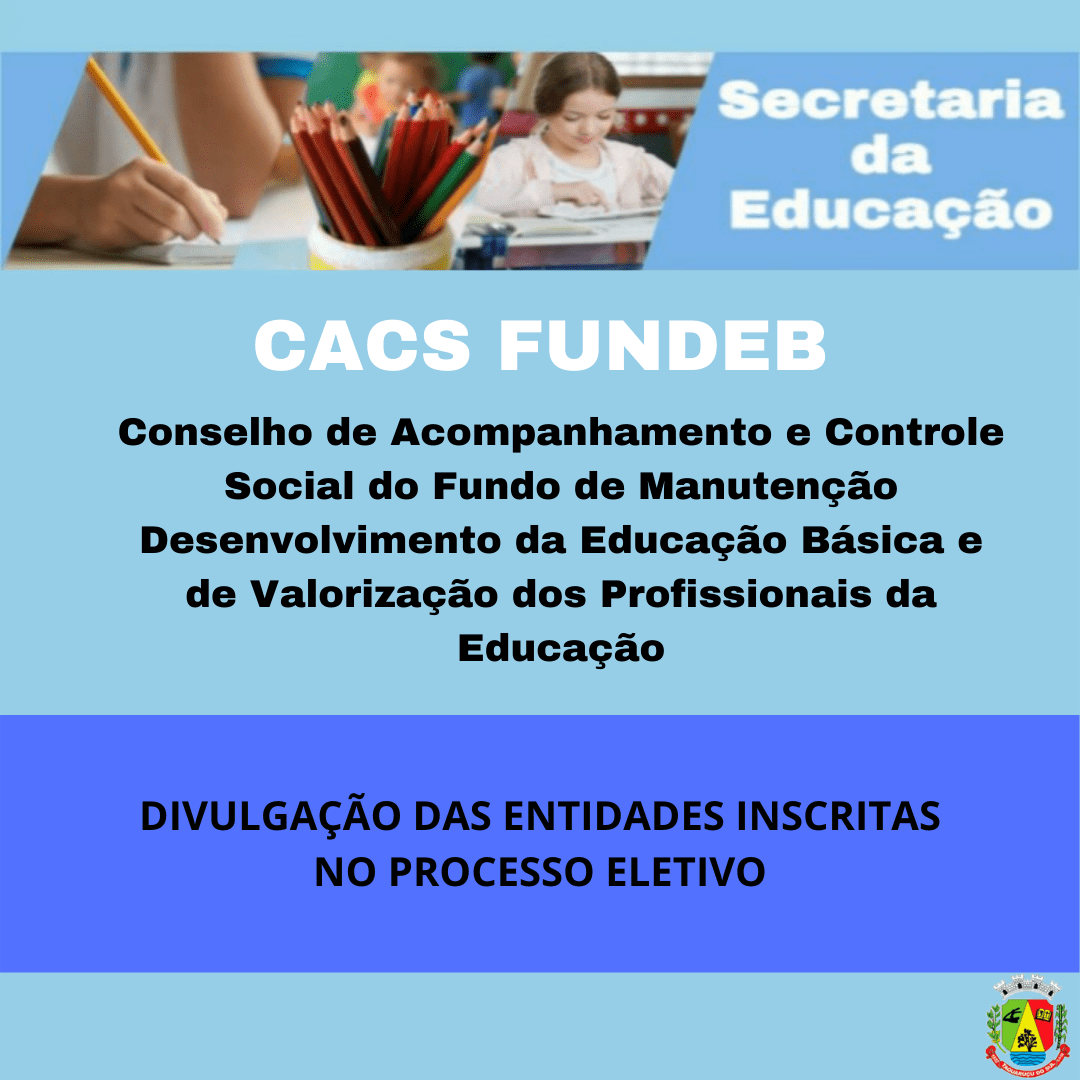 A Secretaria Municipal de Educação e Cultura divulga as Entidades inscritas no Processo Eletivo, e que representarão a Organização Civil para escolha dos Conselheiros, que integrarão o novo Conselho de Acompanhamento e Controle Social do Fundo de Manutenção Desenvolvimento da Educação Básica e de Valorização dos Profissionais da Educação CACS FUNDEB:Conselho Escolar da Escola Municipal de Ensino Fundamental Afonso Balestrin;